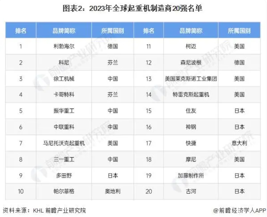 根據(jù)英國KHL集團(tuán)發(fā)布的2023年全球最大起重機(jī)制造商20強(qiáng)排行榜,德國的利勃海爾位居第一,其次是芬蘭的科尼、中國的徐工機(jī)械,整體來看,歐美品牌在全球起重機(jī)制造市場占據(jù)領(lǐng)先地位。