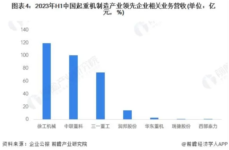 從國內(nèi)領(lǐng)先起重機(jī)企業(yè)經(jīng)營規(guī)模來看,2023年上半年,徐工機(jī)械、中聯(lián)重科兩家企業(yè)的起重機(jī)業(yè)務(wù)營收均超過百億規(guī)模,其次是三一重工的相關(guān)業(yè)務(wù)營收超過70億元,與其它企業(yè)拉開較大差距。